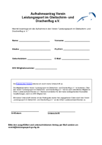 Aufnahmeantrag Verein Leistungssport im Gleitschirm- und Drachenflug e.V. Hiermit beantrage ich die Aufnahme in den Verein “Leistungssport im Gleitschirm- und Drachenflug e. V.“ Name:…