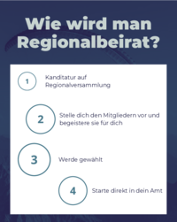 Wie wird man Regionalbeirat? Kanditatur auf Regionalversammlung Stelle dich den Mitgliedern vor und begeistere sie für dich Werde gewählt Starte direkt in dein Amt