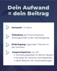 Dein Aufwand = dein Beitrag Amtszeit: 1-3 Jahre Teilnahme auf 3 KommissionsSitzungen/Jahr & der Jahrestagung Einbringung regionaler Themen in die Gremien Ansprechpartner vor Ort Vernetzungsarbeit in…