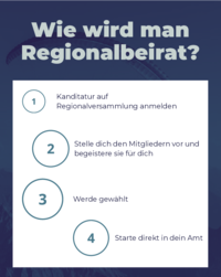 Wie wird man Regionalbeirat? Kanditatur auf Regionalversammlung anmelden Stelle dich den Mitgliedern vor und begeistere sie für dich Werde gewählt Starte direkt in dein Amt