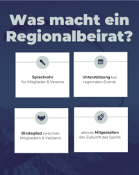 Was macht ein Regionalbeirat? Sprachrohr für Mitglieder & Vereine Unterstützung bei regionalen Events Bindeglied zwischen Mitgliedern & Verband aktives Mitgestalten der Zukunft des Sports