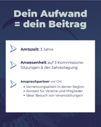 Dein Aufwand = dein Beitrag Amtszeit: 3 Jahre Anwesenheit auf 3 KommissionsSitzungen & der Jahrestagung Ansprechpartner vor Ort Vernetzungsarbeit in deiner Region Kontakt für Vereine und Mitglieder…