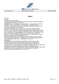 From: Allhoff, Petra Organizational unit: OZ/AD Date: 13.01.2026 Notam D0068/26 A) EDTF B) 2601221445 C) 2601222200 E) TEMPO RESTRICTED AREA EDR FREIBURG ESTABLISHED DUE TO SECURITY MEASURES: 3NM…