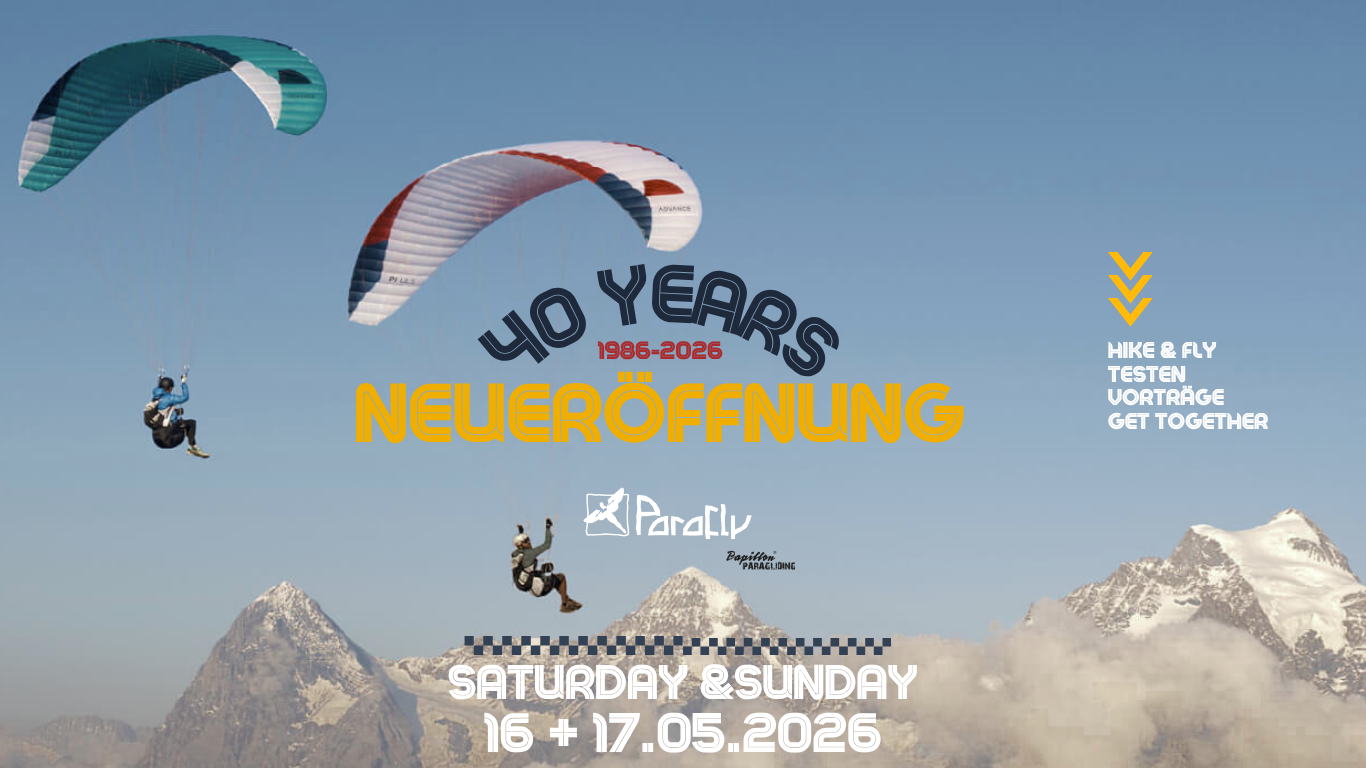 Im Rahmen ihrer Neueröffnung veranstaltet die Flugschule Parafly am 16. & 17.05. ein Testival inklusive Hike & Fly Event und interessanten Vorträgen. Dabei sein lohnt sich!