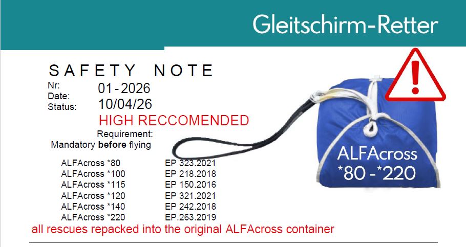 Halter, welche ihren AlfaCross-Retter nach der bisherigen Packanleitung gepackt haben, werden aufgefordert, die Packung zu kontrollieren. Gegebenenfalls ist ein Umpacken gemäß der neuen Packanweisung durchzuführen, die in einer aktualisierten Fassung des Manuals beschrieben ist. Die aktualisierte Packanleitung ist verbindlich anzuwenden.