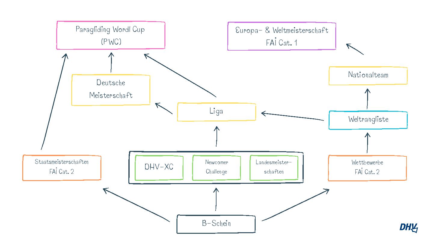 Die Grafik zeigt die verschiedenen Zusammenhänge und Möglichkeiten der Karriereleiter im Gleitschirmsport, vom B-Schein bis zum Superfinal-Gewinner oder Weltmeister.